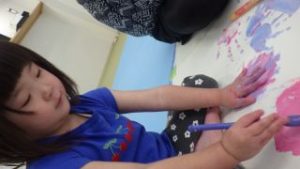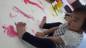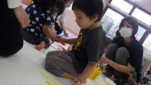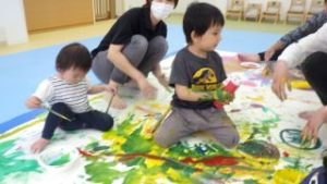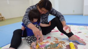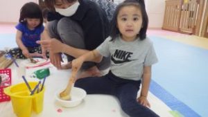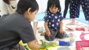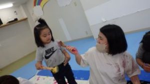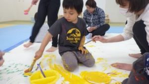 ボディーペイント🖌 2025年5月6日あゆみ 今日は『ボディーペイント』をしました💛 最初は汚れることに対して拒否するお子さんもいましたが、周りが楽しんでいるのを見て少しづつ絵の具を全身につけて楽しむ姿が見られました☻ 大きな画用紙にダイナミックに筆を動かしたり手形を付けたり、足形を付けたり、お洋服に付けたりと思い思い楽しんでいました。 なかなかできない活動でもあったので最後まで楽しんでくれていました♪♪