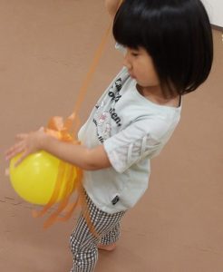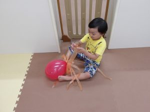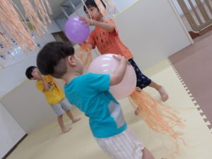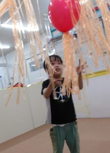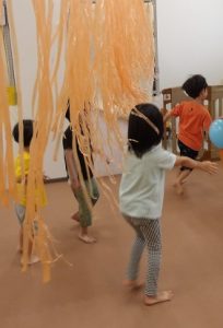 沢山カーテンで遊んだ後は、すずらんテープをつけた風船も使って活動をしました。風船が出てくると「しっぽがついてるじゃん!」と面白がってくれました✨すずらんテープを細く割いたり、風船バレーをしたりしてとっても楽しそうな姿が見られました。それでもタイマーが鳴ると、お約束通りみんなでお片付けをすることができました✨「楽しかった!」「またやりたい!」と笑顔の子どもたちでした♪
