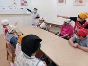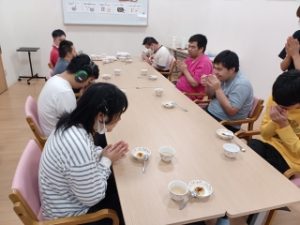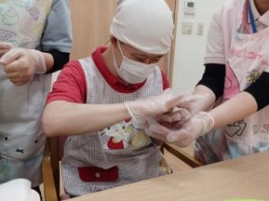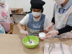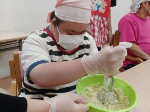クッキング~さつまいも餅~ 2025年10月28日奏の丘 10月に、2グループの皆さんとクッキングを行いました。今回は、旬のさつまいもについて学習をした後、「さつまいも餅」作りに取り組みました。 蒸したさつまいもを力いっぱい潰し、片栗粉等の材料を入れて混ぜ、丸く成型します。マッシャーで潰す、ヘラで混ぜる作業は皆さん慣れており、難なくこなしてくださいます。 ホットプレートで両面を焼き上げ、はちみつをかけて出来上がりです!さつまいものホクホク感と甘さがとても美味しく、皆さんあっという間に完食でした。秋を感じられたクッキングになりました♪