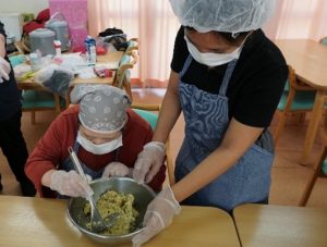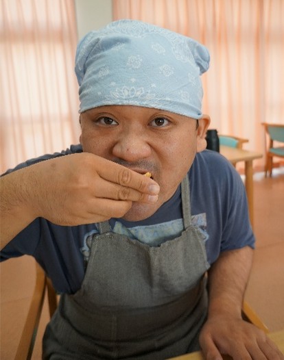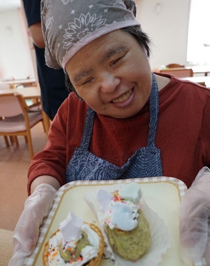スイートポテト作り 2025年10月30日ディライト アジア社会福祉従事者研修でフィリピンから来られているエイプリルさんと一緒に、スイートポテト作りを行いました。芋をつぶす作業が想像以上に大変でしたが、協力して美味しく作ることができました。 10月はハロウィンということでおばけのデコレーションもしてかわいく仕上がり、笑顔で職員に見せてくださいました。