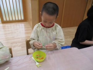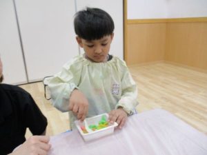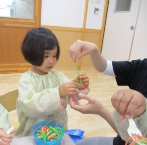 フォークを使って食べる仕草をする子どもや、ナイフを使ってパスタを切る子ども、伸ばして遊ぶ子ども等、カラーパスタの感触を楽しむ子ども達でした。