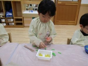 今回はすみれグループとよつばグループの『感触遊び』について、紹介をします。
