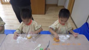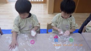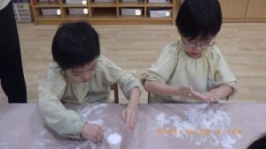 片栗粉粘土に素材が似ている為、触っていない状態だとサラサラとしている粉なのに、握ると固まるという不思議な感覚に子どもたちは、とっても夢中になりながら握ったり・離したりしながら「なにこれ~」「見て!雪だるま」とお友達や職員と会話しながら、感触を楽しむ子ども達の様子も見られました。