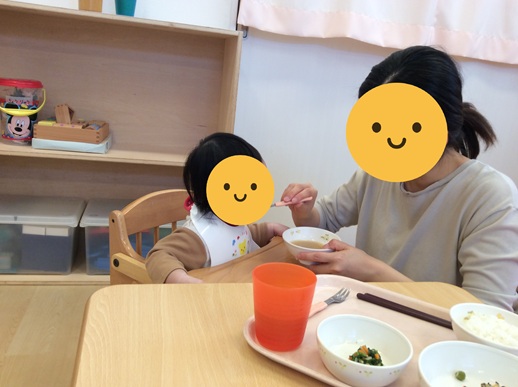 10月29日(水)に、地域の方向けの育児サロン『子どもの食事』を行いました。当日は2組の親子が参加してくださり、お互いに“はじめまして!”ではありましたが、和やかな雰囲気の中、体づくりの要となる食事についてお話をしました。お子さんの年齢によって悩みはそれぞれ。家庭での悩み事をお話しながら、園での対応や食事支援について栄養士からお話をさせていただきました。実際の給食を試食しながら、お母さんが給食の味付けや硬さを確認したり、お子さんがおいしそうに食べて催促している姿を見て「あっ!これ食べられるんだ!お家でも作ろう♪」と発見があったり、実際同年代の園児が食事をしている姿を見て、ヒントや気づきのある貴重な時間となりました☻