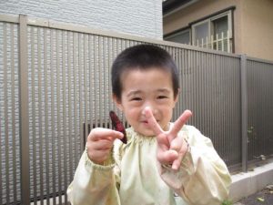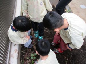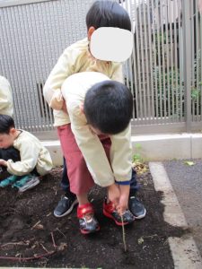 なかなか抜けずに苦戦していると、『大きなカブ』の絵本のように、お友だちの腰に手を添えて「うんとこしょ、どっこいしょ」と声を合わせて協力し始める子どもたち。