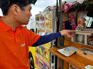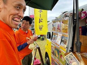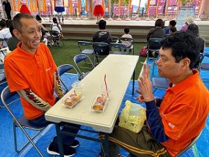 わくわく福祉交流フェア 2025年12月5日明星学園 11月9日にかんまちあにてわくわく福祉交流フェアがありました。会場に着き、利用者よりおやつが食べたいと職員に伝え、キッチンカーの中から食べたいものを選んでいました。注文後はお金を自分で手渡し、会計を行うことができました。 購入後はステージ鑑賞をしながらおやつやジュースを食べ飲みし、嬉しそうにほおばる姿が見られました。笑顔が多く見られ、イベントを楽しむことができました。
