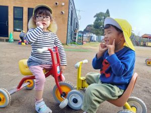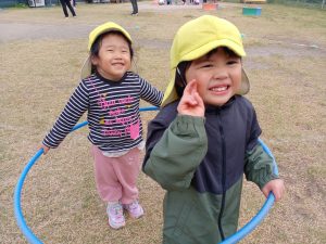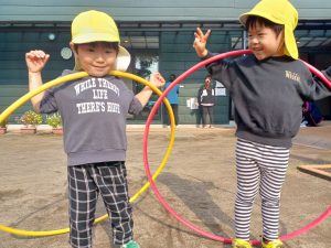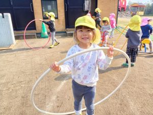 12月になり,一段と寒くなりました。子どもたちは「外に行くよ。」と伝えると「やったー!!」と満面菜笑みを浮かべ園庭へと駆け出して行きます。遊びでは,フラフープを電車に見立て「〇〇さん一緒に入ろう。」とお友達を誘いながら一緒に歩いたり,三輪車に乗って友達と競争したり各々が好きな遊びを選択し体を動かしています。