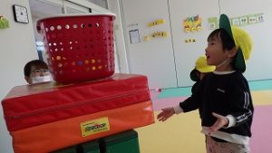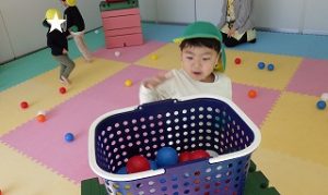 1個ずつ拾い慎重に投げる子ども、両手投げに取り組む子ども、たくさん拾って投げる子どもと取り組み方にも個性がでていました。なかには上投げが難しく力が入り過ぎてしまったり、籠までボールが届かない子どももいたため個別で手添えしながら身体の動かし方を確認したり、下投げで入れる手本を提示し模倣を促したりするうちに少しずつコツをつかめていたようです。