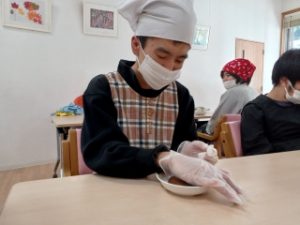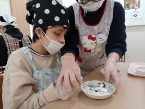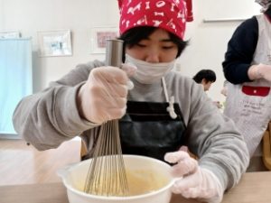 12/24に3グループの皆さんとクッキングを行いました。クリスマスということで、クリスマスリースのような「リースケーキ」作りに取り組みました。