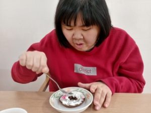 次に、星やハートの型で真ん中をギューっとくり抜きます。クリームを塗る作業は少し難しかったですが、職員と一緒に取り組み、自分で選んだキラキラの飾りをトッピングして完成です!