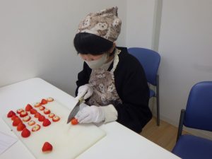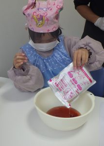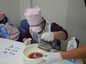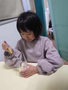 午前中はフルーチェや牛乳を量りながら入れたり、混ぜたりしました。「いいにおいがする。」と嬉しそうに混ぜる姿が見られました。また、包丁の使い方を確認しながらバナナやイチゴを切っていきました。