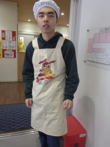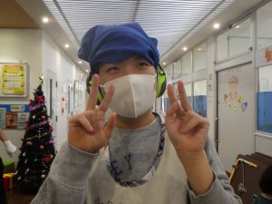 最初に約束事や手洗い等について確認すると「綺麗にするぞ!」と言って、丁寧に手を洗ったり、エプロンや三角巾を被ったりと準備をする様子が見られました。
