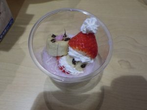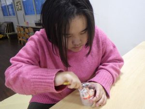 午後からはフルーチェをカップに移し、イチゴやバナナ、生クリームでトッピングをしました。イチゴとバナナを使ってサンタさん作りに挑戦する子もいました。