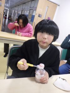 「メリークリスマス!いただきます!」と自分で作ったフルーチェをみんな美味しそうに食べてくれました。