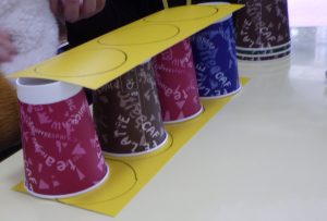 次に、個別の活動で紙コップを積み上げる活動を行いました。視覚的に理解して紙コップを積むことができるようまずは紙コップを置く場所を、厚紙に丸枠を付けて取り組みしました。