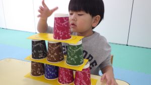 丸枠からはみ出さないようにとても集中して紙コップを置いたり、積み上がったタワーをみて拍手したりして楽しむことができました。また、丸枠ありで何回か練習し、その後丸枠なしで挑戦する子どもさんもおり、達成感や自信にも繋がったと思います。