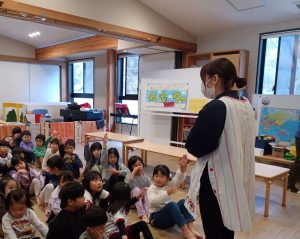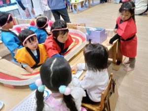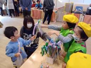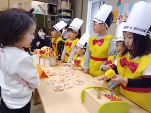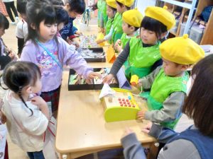 「いらっしゃいませ」のかけ声を合図に,いよいよお店がオープン。商品を紹介したり会計をしたり,それぞれが任された役割を一生懸命に取り組んでいました。また,年下の子にやり方を説明したりお手本を示したり,年長児として成長した姿もたくさんみられました。