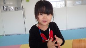 指先の巧緻性を高めることや集中して取り組むことをねらいとして、ストローあそびを行いました。1~2㎝程に切ったストローをたこ糸に通しネックレスやブレスレットを作りました。見本を提示すると「可愛い。」や「わ~。」と反応する子どもたち。糸やストローの持ち方、通し方等の手本を示しながら伝えることで、自分の力で作り始めることができました。1人で通すことが難しい時は、片手のみを使用しストローに糸を入れたり糸を引いたり等、部分的に参加できるように働き掛けました。
