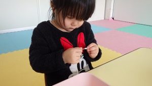 指先の巧緻性を高めることや集中して取り組むことをねらいとして、ストローあそびを行いました。1~2㎝程に切ったストローをたこ糸に通しネックレスやブレスレットを作りました。見本を提示すると「可愛い。」や「わ~。」と反応する子どもたち。糸やストローの持ち方、通し方等の手本を示しながら伝えることで、自分の力で作り始めることができました。1人で通すことが難しい時は、片手のみを使用しストローに糸を入れたり糸を引いたり等、部分的に参加できるように働き掛けました。