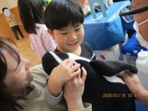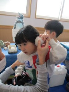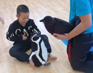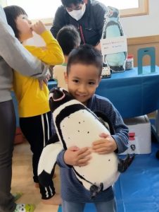 実際のペンギンと同じ重さのぬいぐるみを抱き、「先生、重たいね」「ペンギンさん、かわいいね」「写真撮って!」と、ニコニコ笑顔の子どもたち😊