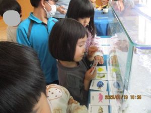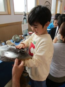 標本に実際に触れることができるコーナーでは、エイやサメの標本に興味津々で触る子どももいれば、少し怖くて触れない子どももいました。それでも職員と一緒に触ってみるなど、普段はなかなかできない貴重な体験をすることができ、とても良い機会となりました。