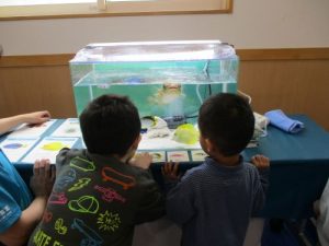大きな水槽の中では、カクレクマノミ、キイロハギ、はなごい、ハリセンボン、ナンヨウハギ、ヤドカリなど、色とりどりのきれいな魚たちが泳いでおり、子どもたちは水槽を覗き込みながら目をキラキラと輝かせ、とても真剣な表情で見ていました👀✨