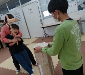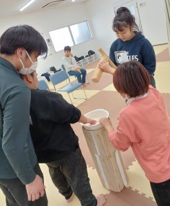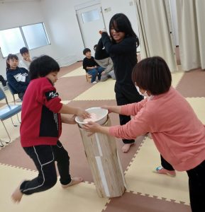 1月初めの活動では、お正月の風物詩を味わう目的で、かるたや福笑い、すごろく等のお正月にちなんだ内容を数日に分けて取り組みました。今回はその中の『餅つきごっこ』と『かるた』についてお伝えします。