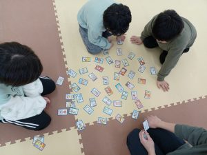 かるたでは、勝ち負けの受容も目的にして行いました。使用したのは、ことわざかるたです。支援者が札を読みあげると「あれ?」「どこだ?」と言いながら札を探し、見つけた後は「そこにあったのか!」「さっきそこ見てたのに…」と悔しがる姿も見られました。「まだ次もあるから大丈夫だよ!」「次は何が読まれるか、よく聞いてね!」と支援者が声を掛けながら進めていきました。それぞれの札に書かれたことわざの意味も勉強し、最後にみんなで勝者に拍手を送りました👏