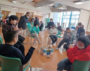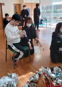 2月3日(火)は節分に因んだリクリエーション「新聞紙ちぎって丸めて鬼退治」ゲームを行いました。「用意スタート!」の合図をもとに、新聞紙をちぎって丸めたら、鬼に見立てた箱に投げ入れます。グループ対抗で、箱の中が新聞紙でいっぱいになるまでのタイムを競いました。