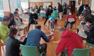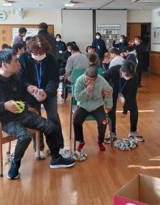 新聞紙を配られたときは何が始まるんだろうとソワソワした様子でしたが、節分のBGMが流れ、ゲームがスタートすると「節分だ!」「豆まきだ!」と皆さん一目散に新聞紙を丸めて箱に投げ入れてました。どのグループも素晴らしいチームワークで接戦でしたが、今回の1位は海グループ!