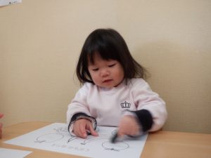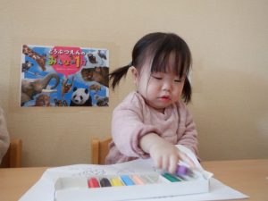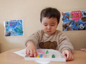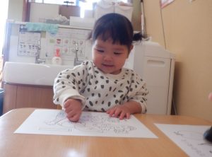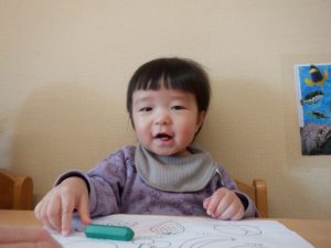 お絵かき遊び (いちご組) 2026年2月5日石谷の森 物や色に興味を示す姿が多く見られるいちご組の子どもたち。今回は,くれぴつを使ってお絵描きを楽しみました。 好きな色を選び,ぐるぐる描いたりとんとんと点をつけたりと思い思いに表現し,イラストカードと合わせながら色に触れる姿が見られました。「先生,みてみて」と嬉しそうにお話をする子どもたちの表情がとても素敵でした。 これからも,お絵描きや製作を通して,色や形に親しみながら,表現する楽しさを大切にしていきたいと思います。