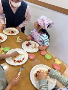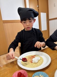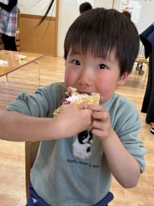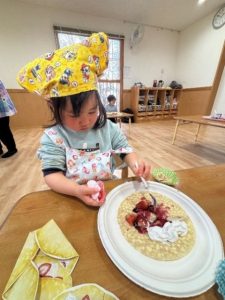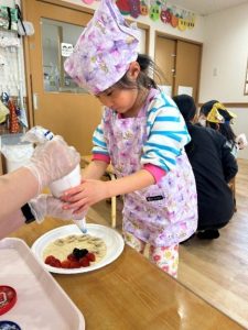 にじ 食育(クレープ作り) 2026年2月14日くにたち にじグループでは、「様々な食材に触れること」「自分で作る経験を通して食事を楽しむこと」等をねらいとして食育の活動を取り入れています。今月はクレープ作りを行いました。それぞれ好きなフルーツやジャム、クリームを選んで上手に包み、沢山食べて楽しんでいた子どもたちでした♪フルーツやジャム、クリームが苦手な子も一口挑戦してみたり、自分で作ることを楽しんだりしていました。