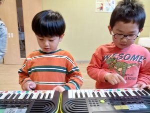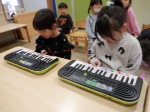 初めは「難しい」「どこにある?」と苦戦していましたが,繰り返すうちに「できた!」と嬉しさを感じていました。次回は,『きらきら星』や『チューリップ』の曲にチャレンジしてみます。