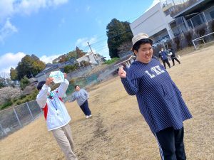 創作活動(凧揚げ) 2026年2月19日サポート明星 2月12日(木)、凧揚げを行いました。好きなイラストを描いて作成した凧を手に嬉しそうにグラウンドに向かわれた皆さん。風があまり吹いていなかったため凧が揚がるか心配されましたが、グラウンド内を走ると凧が揚がり、皆さんもテンションアップ!しばらくグラウンドで凧揚げをしたり、作成した凧と一緒に記念撮影をしたりと楽しそうに過ごされていました。寒い日が続いていますが、室内での活動だけでなく室外でも楽しめるような活動を計画してまいります。