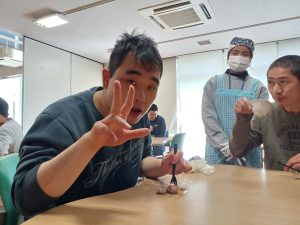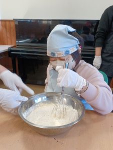 2月18日(水)は空・海グループ、2月19日(木)は星・花グループの全体クッキングを行いました。今回のメニューは「たこ焼き器で作るチョコエッグワッフル」です。ボウルに材料を入れて、よく混ぜます。皆さん「自分がやりたい!」と元気よく手を挙げて参加してくださいました。
