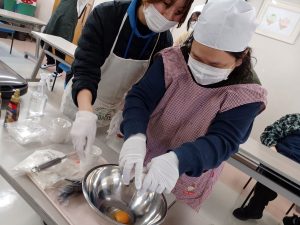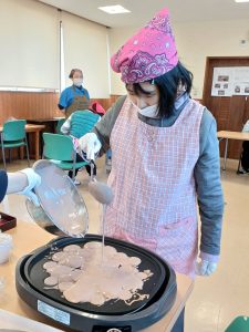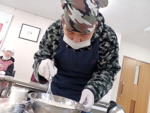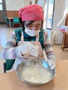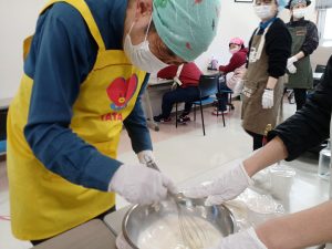2月18日(水)は空・海グループ、2月19日(木)は星・花グループの全体クッキングを行いました。今回のメニューは「たこ焼き器で作るチョコエッグワッフル」です。ボウルに材料を入れて、よく混ぜます。皆さん「自分がやりたい!」と元気よく手を挙げて参加してくださいました。