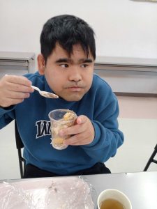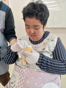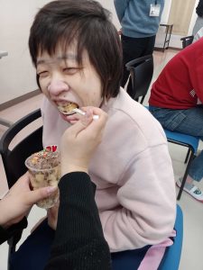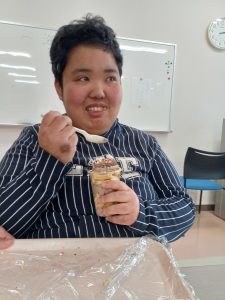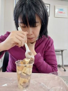 バナナをスケッパーで切る工程では、各自食べやすい大きさで切ることができました。次にコップの中に砕いたウエハースを入れ、職員が手添えをしながらチョコホイップを綺麗に回し入れました。バームクーヘンを小さくちぎりながらコップに入れ、チョコホイップ、バナナ、バームクーヘン、チョコホイップの順に入れ、最後にカラースプレーをトッピングして美味しそうなミニパフェの完成です。