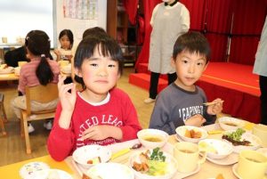 ぶどう組~バイキング~ 2026年3月2日 2月20日にぶどう組でバイキング給食がありました。 朝から「バイキング楽しみ!」という声がたくさん聞こえ、給食の時間を今か今かと心待ちにする様子がありました。 バイキングの約束事として「とったものは残さない」や「バランスよくとる」など伝えると、真剣に聞く子どもたち。 何度もおかわりをして、たくさん用意して頂いた料理は空っぽに!こども園での思い出がまた一つ増えたぶどう組さんでした。