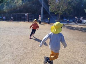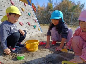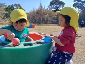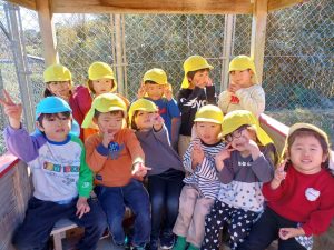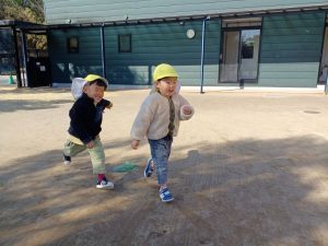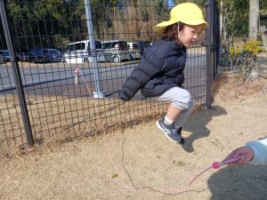 寒さは続きますが,陽が出ると日中は暖かく,元気に園庭を走り回り汗ばむほどの陽気です。りんご組になったばかりの頃は,一人ひとりが好きな遊びを選択し時間いっぱい遊んでいましたが,月日が経つにつれ,クラスのお友達や年上のお友達と,一緒に追いかけっこをしたり会話をしながらお店屋さんに見立てて砂場で遊んだりと,友達との関わりが増えています。また,年上の子どもたちが遊ぶ様子を見て,縄跳びに挑戦する等,遊びの幅も広がっており,跳ぶことができると自信に満ち溢れた顔で「先生,見ててー。」と嬉しそうに駆け寄ってきます。
