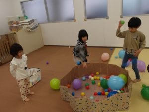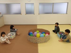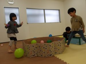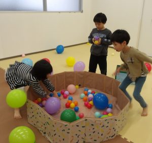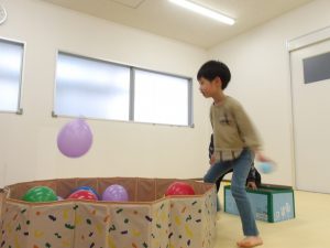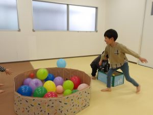 風船の大きさを変えることで難しさを加えました。小さい風船は跳ねづらく子どもたちも苦戦していましたが支援者が当てて浮かした風船にボールを当ててはじき出すという協力プレーをしてみました。見事に上手くいくと「やった~!!」と当たったことに大喜びしていました😄