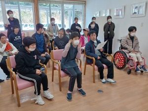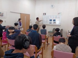 2月24日(火)に1・2グループで水族館へ行きました。午前中は、事前学習を行いました。水族館の写真を見ながら職員の説明を聞かれ、とても楽しみにされている様子でした。