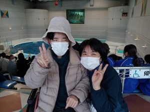水族館に到着後、まずはイルカショーを見にいきました。イルカが高く飛ぶと、「わーすごい」と驚きながらも楽しまれていました。