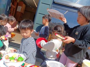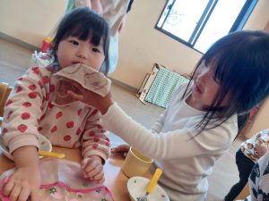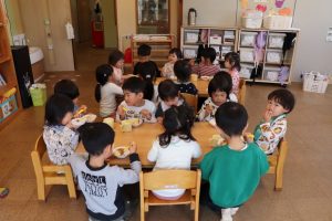 活動後は,みんなで仲良くおやつを食べました。「美味しいね」「手伝ってあげるね」と優しいぶどう組のお兄さんお姉さんたちとのふれあいに嬉しそうなさくらんぼ組の子どもたちでした。