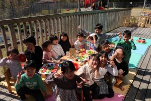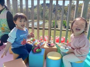 先日,卒園を控えているぶどう組さんと一日交流を楽しみました。ぶどう組さんがキッチンや机,いすのセッティングを行い,ままごと遊びを行いました。みんなでご飯を作って運んだり,机を囲んで食べたりにぎやかな時間となりました。