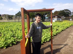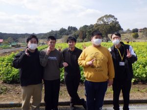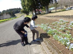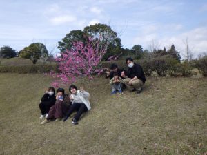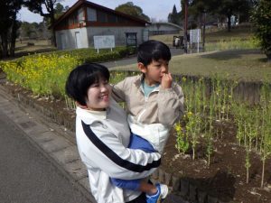 菜の花や梅などの季節の草花や都市農業センターで育てられている野菜などを「綺麗だね。」「あれは白菜だ。」と職員や子どもたち同士でお話を楽しみながら散策を行いました。木の実を見つけると子どもたち同士で木の実を使って遊ぶ様子も見られ、和やかに散策を楽しむことができました。最後はみんなで一緒にフォトスポットで写真を撮り、思い出を写真に残しました。
