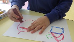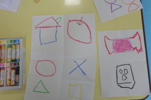模倣を繰り返すごとに、子どもたちなりに、形や色をよく観察し、特徴を捉えて描くことができていました。また、手指や手首を動かすことや非利き手で用紙を抑える動作なども意識的にできており、徐々に見本に近い絵や形になることで、達成感や充実感が増していく様子がみられました。