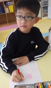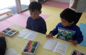 模倣を繰り返すごとに、子どもたちなりに、形や色をよく観察し、特徴を捉えて描くことができていました。また、手指や手首を動かすことや非利き手で用紙を抑える動作なども意識的にできており、徐々に見本に近い絵や形になることで、達成感や充実感が増していく様子がみられました。