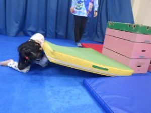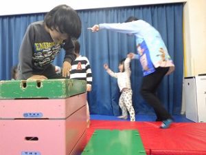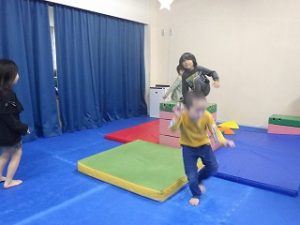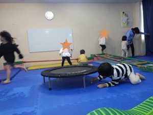 その後、支援者が室内に写真を隠して、合図とともに一斉に探し出しました。マットや平均台の下を覗いて見つけると「見つけた!」「〇〇くんのがあったよ、はいどうぞ!」等大喜びしながら、友達と写真を見せ合う姿が可愛らしかったです♪