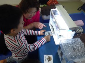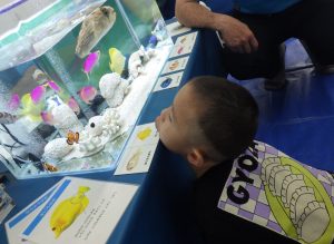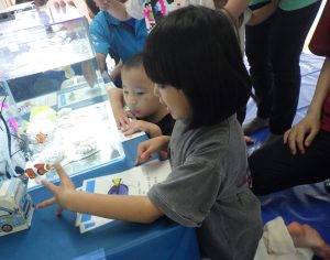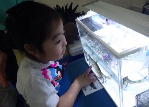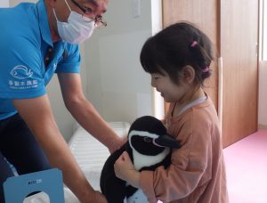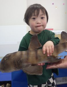 水槽の中にいる魚をキラキラした目で見ている子もいれば、本物と同じ重さのペンギンを持ったり、本物と同じ肌触りのサメやエイの模型を触ったりなど、みんな興味津々で楽しんでいました♡