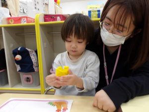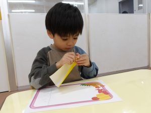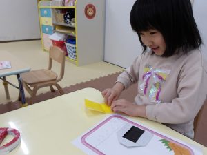 折り紙[ねらい:指先に集中して取り組むことができる。] 2026年4月29日サニーキッズ 4月23日に「折り紙」を行いました。今回は、おにぎり・トマト・卵焼きの3つの食べ物の折り紙に子どもたちは挑戦しました。 三角や四角などの基本的な折り方はもちろん、今回は紙の先端を少し折ったり、折り返したりと細かな動作もあり、指先に集中して頑張る姿が見られました。 完成した折り紙は、お弁当箱の台紙に自由に貼り付けていきました。「おにぎりには梅干しいれたいね。」「卵焼きはもっとこうしたい!」とそれぞれのイメージを膨らませながら子どもたち特製の素敵なお弁当が完成しましたよ。